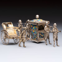 A Chinese enamelled silver model of four bearers and a silver model of a bearer, Guang Sheng Yuan 廣生源 and Yan Ji 衍記 mark, 19th C.