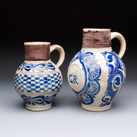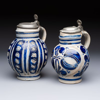 Two Westerwald tankards with mounted pewter lids, one lid dated 1757, Germany, 18th C.