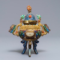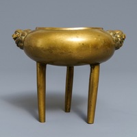 A Chinese bronze tripod censer with lion head handles, 19/20th C.