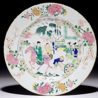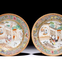 A pair of Chinese famille rose plates with figures on a terrace, Yongzheng