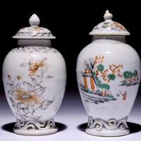 A pair of Chinese grisaille, gilt and iron red cups and saucers and a covered bowl, Qianlong
