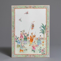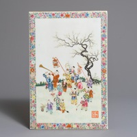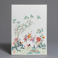 A fine Chinese famille rose plaque with playing boys, seal mark, 19th C.