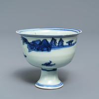 A Chinese blue and white stem cup with landscape design, Transitional period