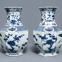 - The five-piece garniture, 19th C., probably of Samson origin, with a large rim section missing to one of the covered vases. The second covered vase with a 2 cm hairline. The covers in good condition. The two beaker vases in very good condition.