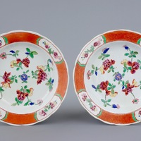 A pair of Chinese famille rose flower-shaped large plates with roosters, Yongzheng, 1723-1735