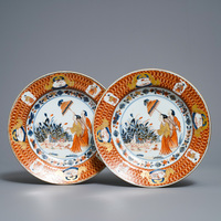 A pair of Chinese Imari-style plates after Cornelis Pronk: 'Dames au Parasol', Qianlong