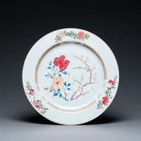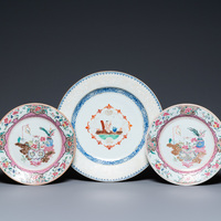 A pair of Chinese famille rose plates and a bianco sopra bianco dish, Qianlong