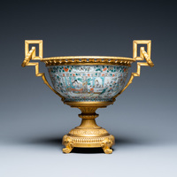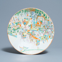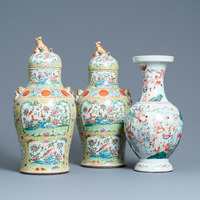 A pair of Chinese Canton famille rose yellow-ground vases and a 'warrior' vase, Qianlong mark, 19th C.