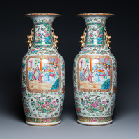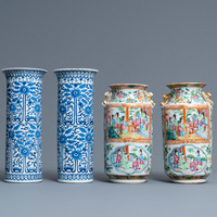 A pair of Chinese blue and white and a pair of Canton famille rose vases, 19th C.