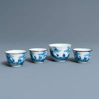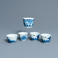 The cup on the far left with a fisherman in a fine landscape marked 'Jade tower' (CN: '玉楼' - 'Yu Lou', VN 'ngoc lau').