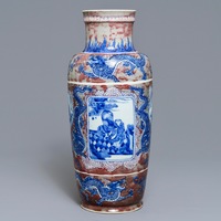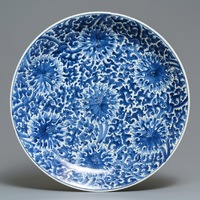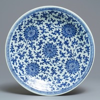 A large Chinese blue and white lotus scroll dish, Kangxi