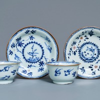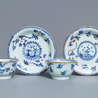 - One cup with a tight ca. 5 mm glaze line on the outside, not visible on the inside, and a ca. 1 mm chip on the outer rim, otherwise in good condition.