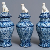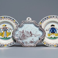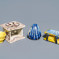 A manganese Dutch Delft miniature stove, a blue and white shell and a French book-shaped handwarmer, 18th C.