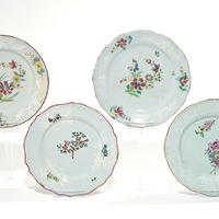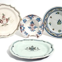- The top right plate with exstensive glaze loss on the rim and small surface chips, with a ca. 4 cm hairline from the rim at ca. 10 o'clock.