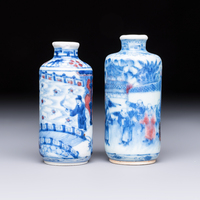 Two Chinese blue, white and copper-red snuff bottles with figural design, 19th C.