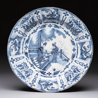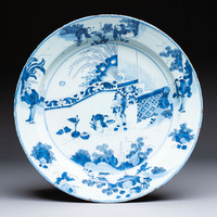 A large blue and white Dutch Delft chinoiserie dish, 17th C.