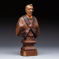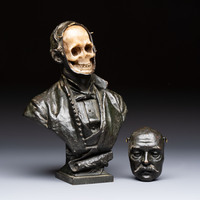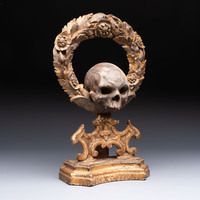 An Italian 'Memento Mori' wooden funerary palm holder with a plaster skull, 19th C.
