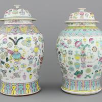 Deux pots couverts en porcelaine de Chine à décors d'objets de lettrés, famille rose, 19e