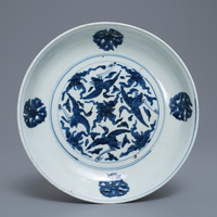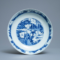 Un plat en porcelaine de Chine en bleu et blanc à décor d'un paysage fluviale, Jiajing