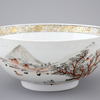 - With a section of the rim of ca. 11 cm broken out and restuck going down as far as 5 cm, with a related hairline going down from the rim over ca. 5 cm on one of the breaking points. The base with a very tight star-shaped hairline, invisible to the naked eye but showing up onder UV-light.