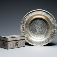 Une boîte couverte de forme rectangulaire et un bol à décor d'un dragon en métal paktong, Chine, 19/20ème