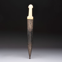 A Caucasian gilt Damascus steel 'Khinjal' with a whale bone hilt and a leather and damascened steel scabbard, 19th C.