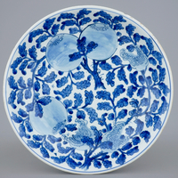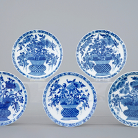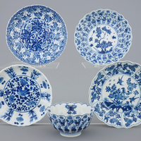 Drie blauw-witte Kangxi bordjes en een lotusvormig kommetje op onderschotel, Kangxi