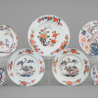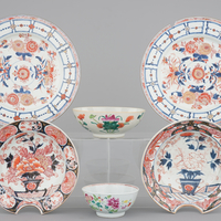 A pair of Chinese Imari porcelain dishes and two famille rose bowls, with 2 Japanese Imari shaving bowls, 18th C.