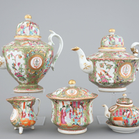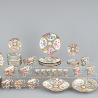 A 62-piece Chinese Canton rose medallion armorial 6-person service of big and small plates, cups and saucers, egg cups and serving trays, 19t C.