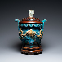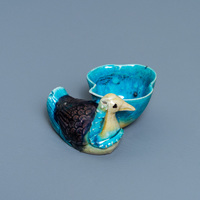 Een Chinese aubergine- en turquoise-geglazuurde waterdruppelaar in de vorm van een eend met een lotus, Kangxi