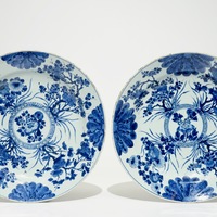 Een blauw-wit Chinees gecontourneerd bord met een jachtscène, Kangxi