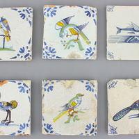 Lot van 6 polychrome en blauw en witte Delftse tegels, 17e eeuw