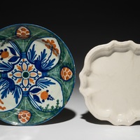 Een fraai polychroom Delfts bord met een tuinvrouw met dochter, 18e eeuw