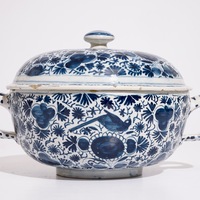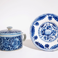 Een blauw-witte Delftse brandewijnkom met floraal decor met pauwen, begin 18e eeuw