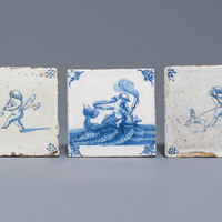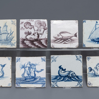 Acht blauw-witte en mangane Delftse tegels met schepen en zeewezens, 17/18e eeuw